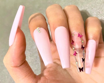 Press On Nails Pink Butterfly Nails Geode Nails Long Etsy Pink Nails Butterfly Nail Light Pink Acrylic Nails
