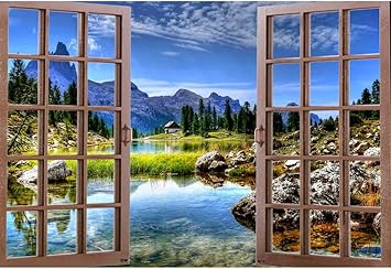 Amazon Com Csfoto Polyester 7x5ft Natural Scenery Backdrop Window View Mountain And Water Tree Blue Sky Lake Outdoor Natural Landscape Living Room Decor Background For Photography Interior Decor Wallpaper Camera Photo
