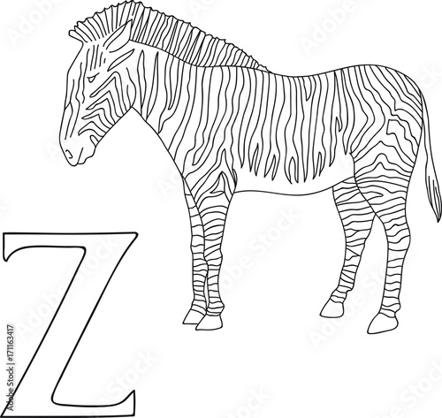 Vector Hand Drawn Illustration Capital Letter Z On Alphabet Card Black And White Realistic Zebra Isolated Kids Abc School Education Coloring Page For Children Stock Vector Adobe Stock